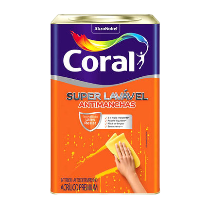 Super Lavável é uma tinta acrílica de alto desempenho, indicada para ambientes internos. Com sua inovadora tecnologia Ultra Resist, Super Lavável é duas vezes mais resistente à limpeza em relação às tintas premium foscas, repele líquidos e facilita a limpeza de manchas de chocolate, ketchup, café, refrigerante, suco, lápis, caneta hidrográfica e batom, e não tem cheiro. Seu acabamento Eggshell tem um nível de brilho muito próximo ao acabamento fosco, o que ajuda a disfarçar as imperfeições da parede. Rende até 110 m² acabados por embalagem de 18L.